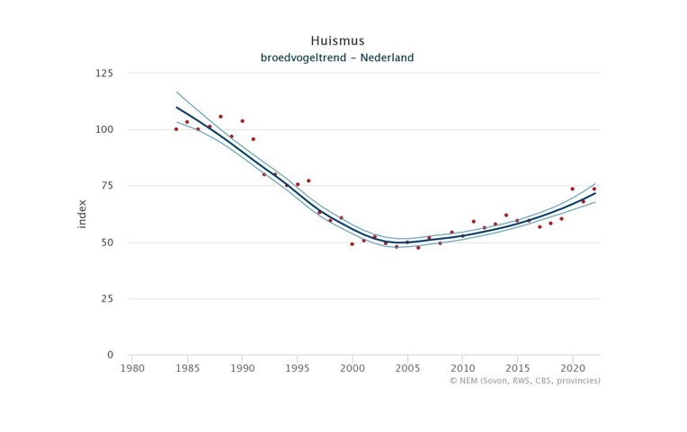 Trend van broedende Huismussen in Nederland (1984-2022) op basis van BMP- en MUS-tellingen.