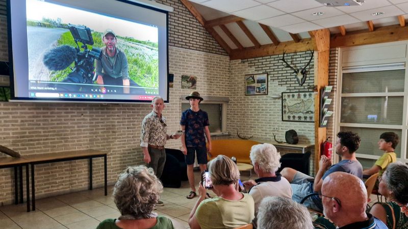 Ondanks de hoge temperatuur op zaterdag 21 juni waren er veel mensen aanwezig om te genieten van de film “De Wilde Waard”. De voorzitter, Marcel Hoornweg van de Natuur- en Vogelwacht ‘De Alblasserwaard”, zette Daan van der Vliet als eerste in het zonnetje. Ook hield hij een inleidend praatje over de werkzaamheden van de Natuur- en Vogelwacht. Daan van der Vliet is uitgeroepen tot jonge vogelaar van het jaar 2025. De vereniging is heel trots op het jonge lid. Tevens kreeg Daan uit handen van de voorzitter een attentie aangeboden voor zijn verdienste.