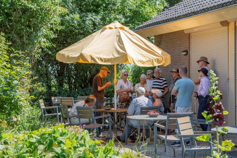 Aansluitend ging men na de film voor een wandeling richting de Heemtuin. Men kan in de Heemtuin rustig wandelen op kleine schaal en de meeste landschapselementen bekijken van de (vroegere) Alblasserwaard. En vooral de planten, struiken en bomen die er weelderig groeien, zijn een lust voor het oog. Leen den Ouden was de gids en zijn enthousiasme over de Heemtuin bracht hij over op de belangstellenden. Kortom een hele geslaagde dag voor zowel de bezoekers als de organisatoren.