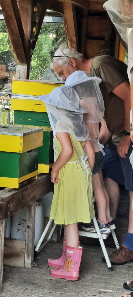 Er bloeiden grote zonnebloemen waarvan we de pitjes al een beetje konden zien. Bij de imker heeft een aantal kinderen en ook een ouder het aangedurfd om met een beschermkap op heel dicht bij de bijenkasten te komen. En zodoende wat meer over bijen te leren.