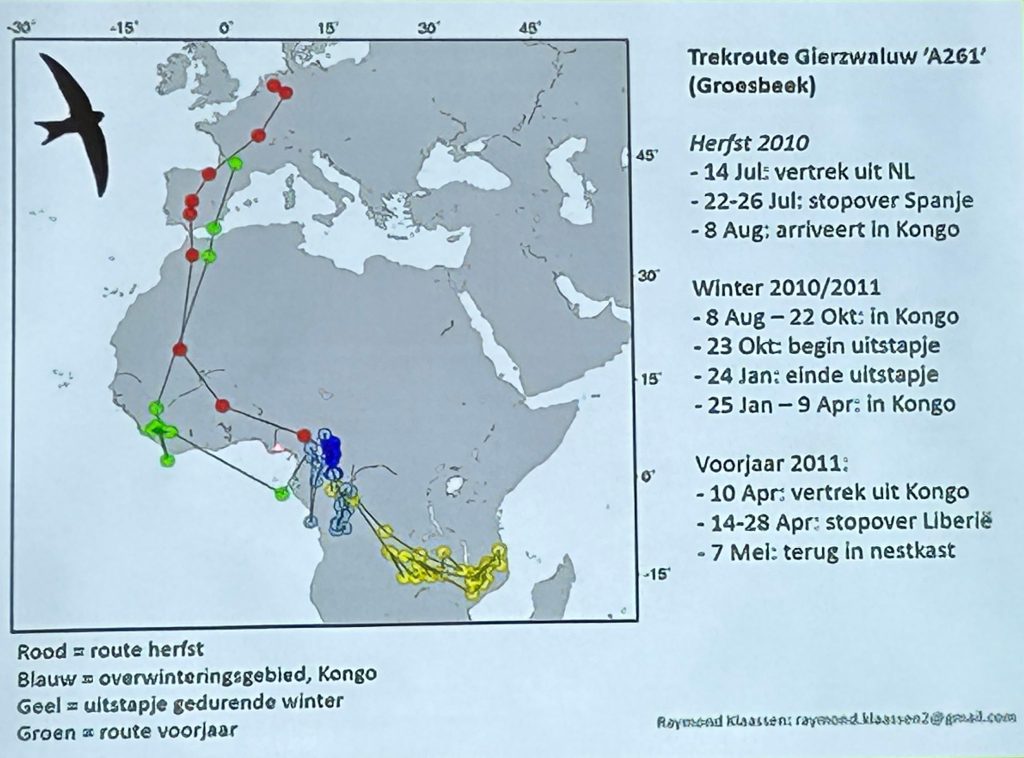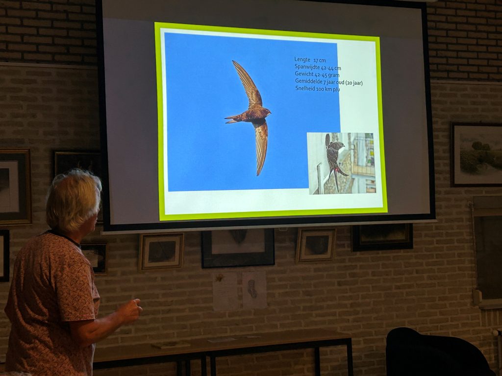 Ademloos luisterden de aanwezigen in het Streeknatuurcentrum naar de lezing van Bert Vos, coördinator Vogelwerkgroep West-Betuwe. Zijn lezing was onderhoudend en hij beschreef hoe de gierzwaluwen rond 30 april ons land binnenkomen en op 1 augustus weer vertrekken richting Afrika.