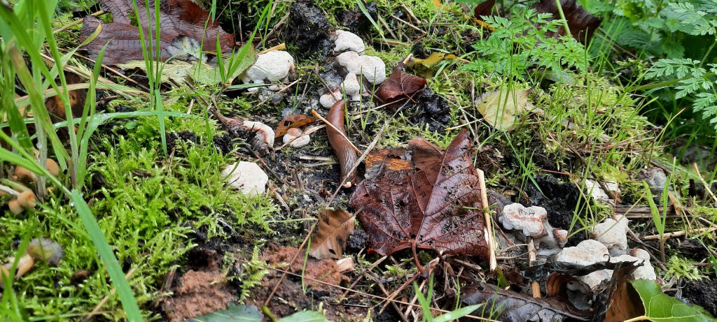 De Dennenmoorder en een groepje beginnende Bundelinktzwammetjes. Ze werden gezelschap gehouden door een naaktslak. Naaktslakken eten graag van paddenstoelen. Je ziet ook vaak de hapjes die er uit genomen zijn. Een andere vondst was de Tonderzwam. Deze op hout lijkende zwam groeit tegen een boom en kan elk jaar groter worden. Voor de boom is dit niet fijn want uiteindelijk zorgt de zwam ervoor dat de boom langzaam afsterft. Dat kan nog wel lang duren. Dus, wie weet, zien we deze Tonderzwam volgend jaar weer.