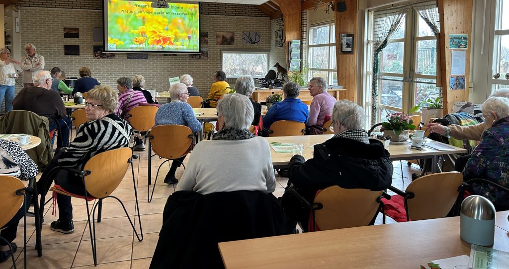 Er zaten ruim 31 ouderen van de Zonnebloem Alblasserdam/Papendrecht in de zaal, die aandachtig luisterden naar de presentatie. Ze werden begeleid door 11 vrijwilligers. Koos Leeuwenstein van de afdeling PR en Communicatie van de Natuur- en Vogelwacht “De Alblasserwaard” vertelde op 12 februari over het ontstaan van de Alblasserwaard en ook over de doelstellingen en activiteiten van de Natuur- en Vogelwacht “De Alblasserwaard”. Het ging met name over de kwetsbaarheid van de natuur. Ook werd er aandacht geschonken aan de verschillende vogelsoorten, insecten en planten in de Alblasserwaard. Dit gebeurde aan de hand van mooie en duidelijke afbeeldingen.