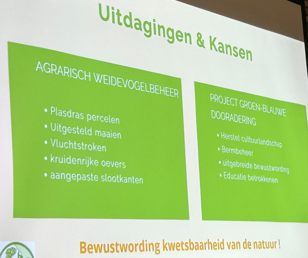 Koos besteedde ook aandacht aan de staat van de natuur in de Alblasserwaard. Vanaf 2000 is het aantal weidevogels met 50% gedaald. De aantallen grutto’s zijn de laatste 5 jaar gelijk gebleven. Bijna verdwenen uit het landschap zijn de scholekster en de veldleeuwerik. Er is een duidelijke afname van insecten met 50 tot 60 %. De aantallen grasland- en argusvlinders zijn teruggelopen en dit geldt ook voor de loopkevers en motten. Met de vaste planten, kruiden, mossen is het niet goed gesteld en geldt er een afname van gemiddeld 30 tot 50%. De oorzaak van deze afnames moet gezocht worden in de herhaalde bemesting en het intensieve maaibeheer. Ontwatering, stikstof en verzilting zijn eveneens de boosdoeners. Daarentegen is het Engels raaigras enorm toegenomen.
