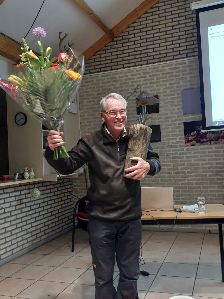 Jan blijft wel nesten zoeken in het veld en als dank voor zijn tomeloze inzet is hij benoemd tot Erelid van de weidevogelwerkgroep de Alblasserwaard. Een mooie bos bloemen en een toepasselijke Gruttotrofee bij hoort daarbij.
