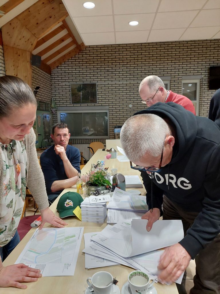 Tijdens de pauze was er gelegenheid voor elke vrijwilliger om zijn/haar stalkaarten, percelenkaarten, notitieboekjes en markeerstokken etc. uit te zoeken. Dit alles hebben zij nodig tijdens hun werkzaamheden bij het bedrijf waar zij gaan zoeken.